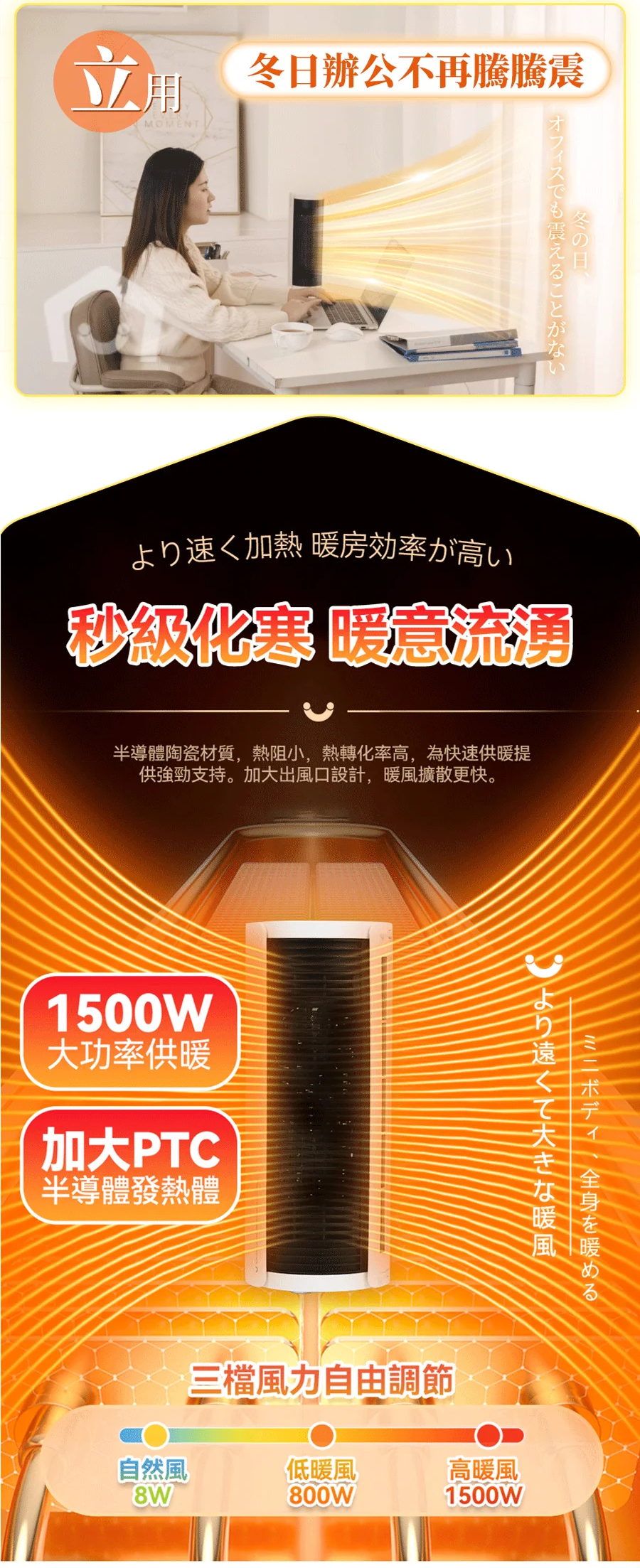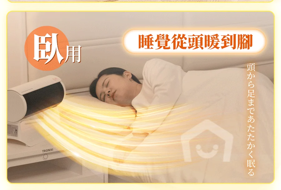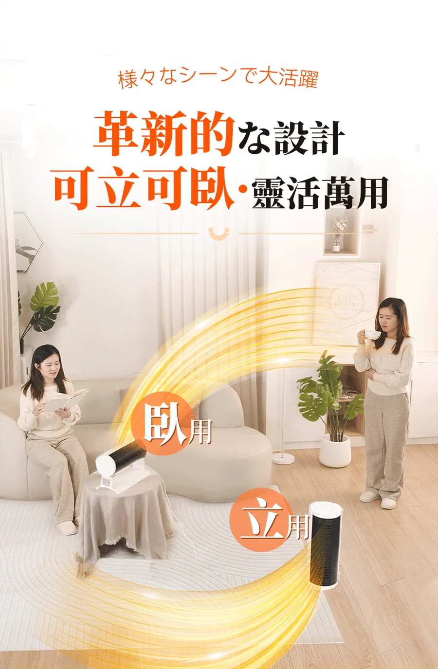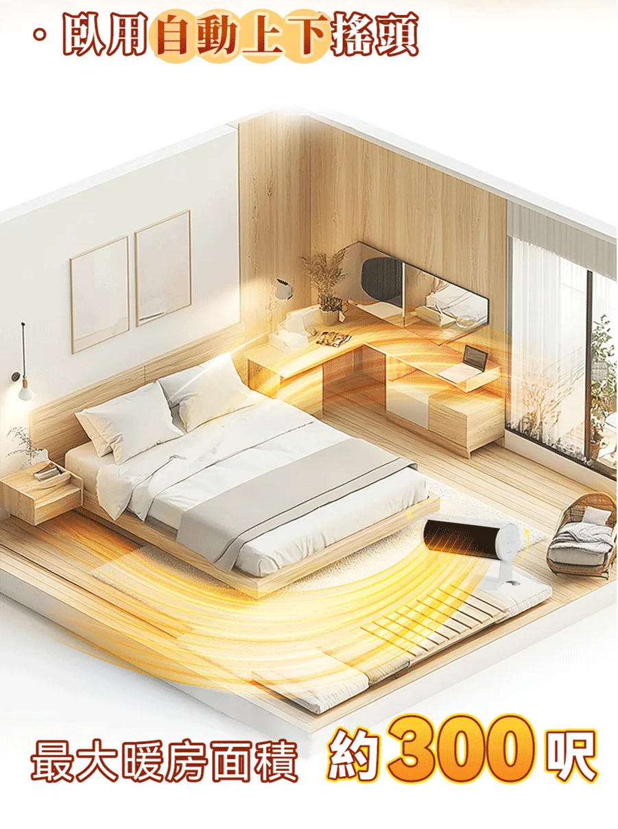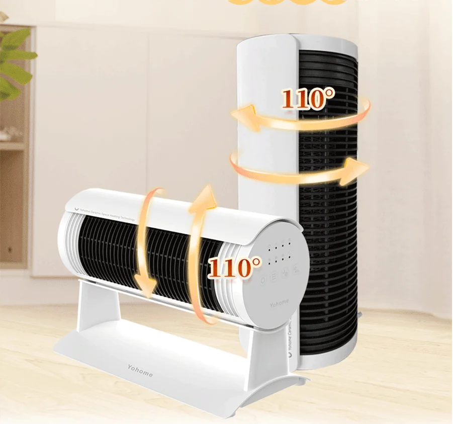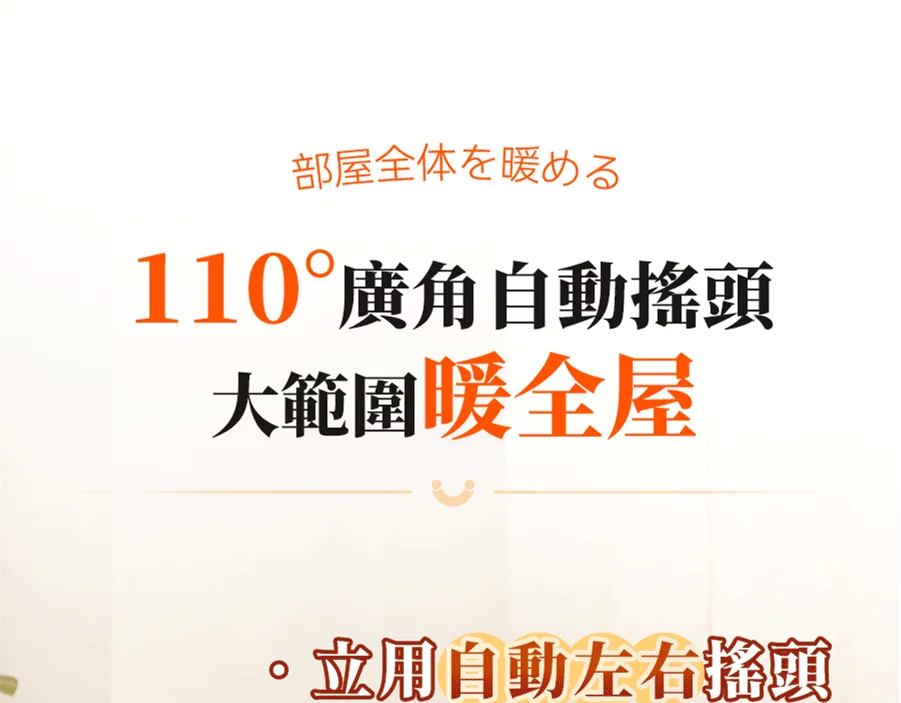 1.上下自動搖頭110°,縱向放置即變成左右自動搖頭110°,廣角送暖、循環加熱,隨時調節暖風送達位置。