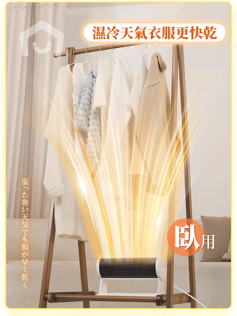 3.恆溫PTC快速制熱,三擋調溫,冷暖可用,最大角度可垂直上吹烘乾衣物。