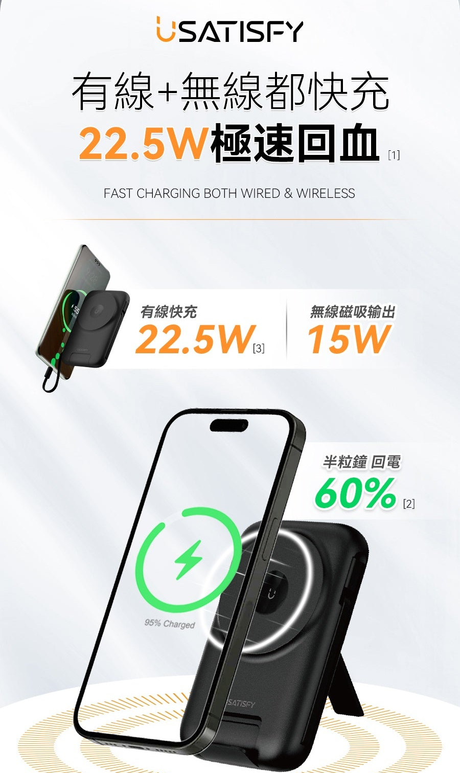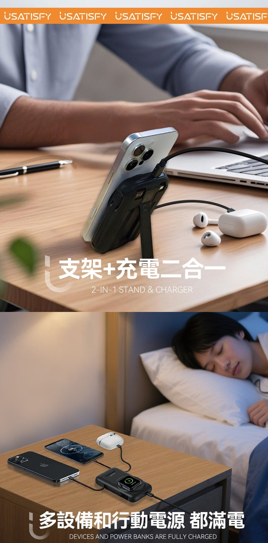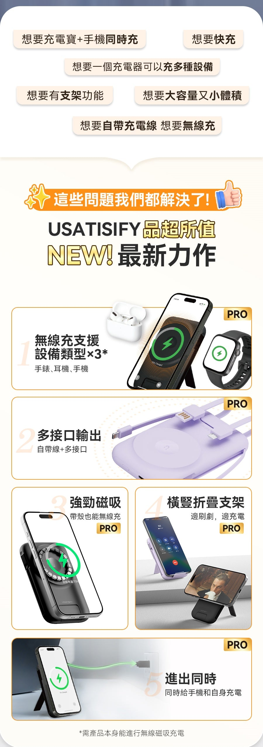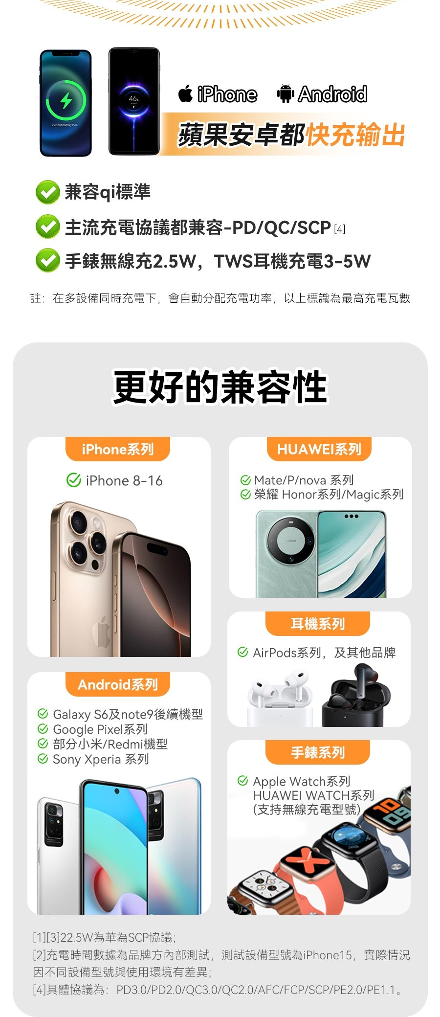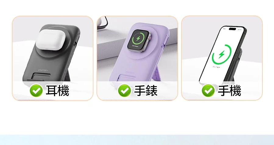 1.無線快充:支援手機/耳機/手錶無線磁吸充。