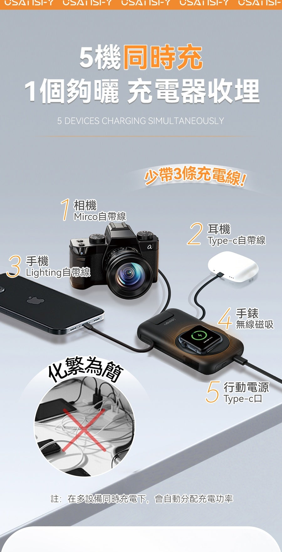 2.多設備充:自帶4線,可5個設備同時充電。