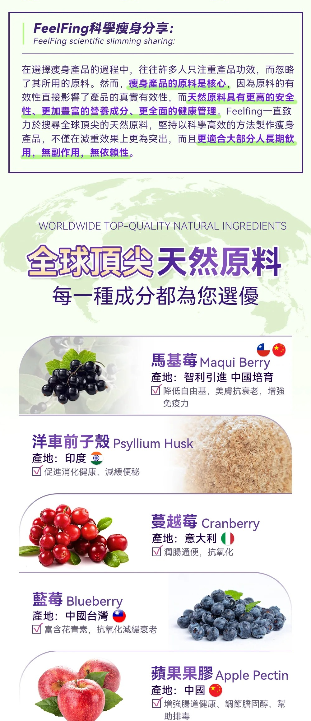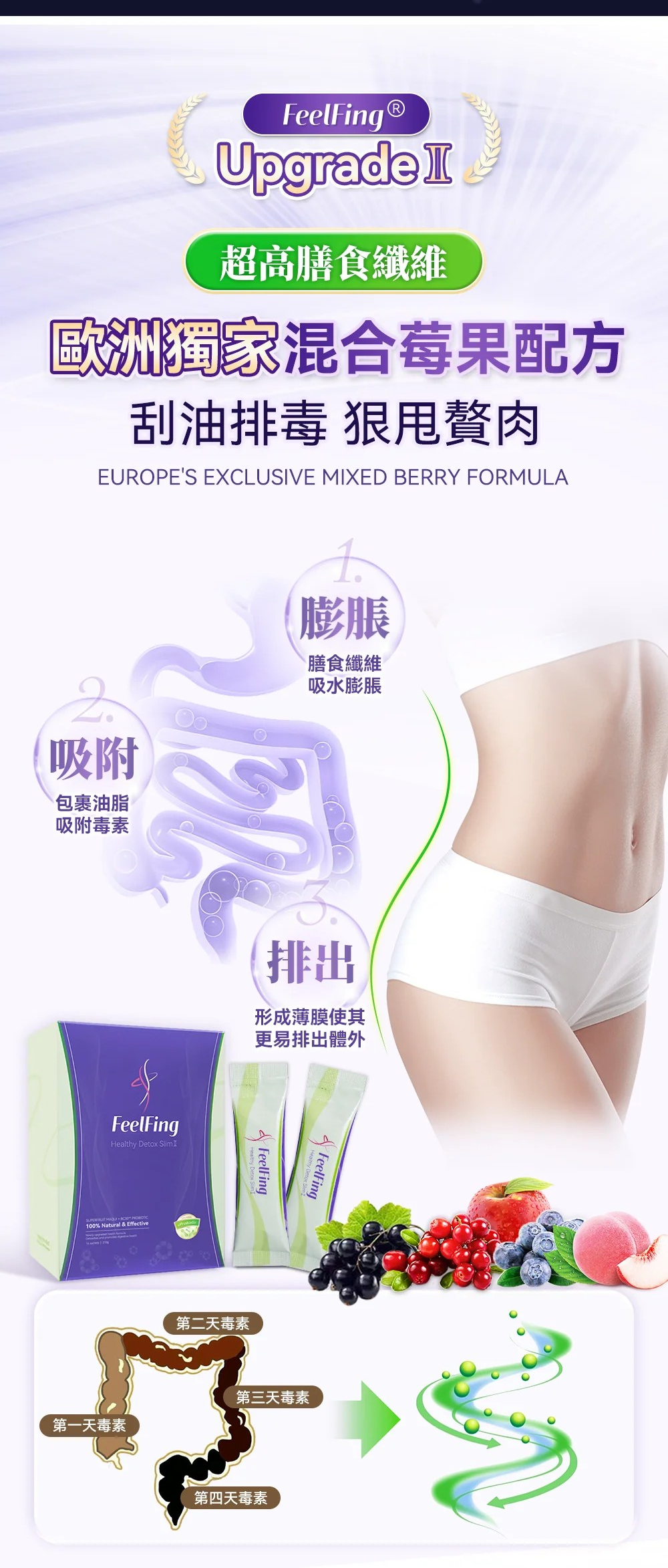 1. 升級配方復合混合莓果配合益生配方,保持混合莓果刮油排毒瘦身、改善便秘和水腫的同時,益生配方有助於腸道健康和腸道養護。