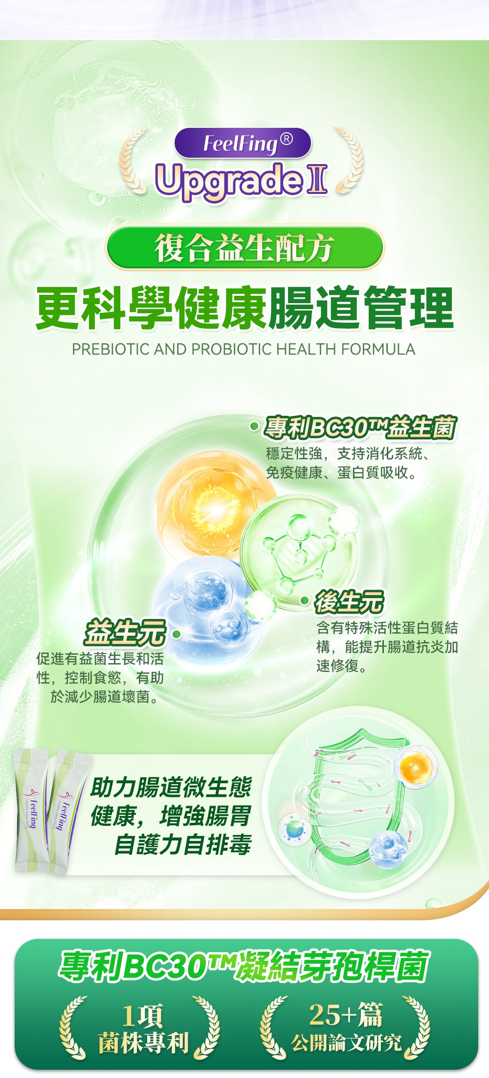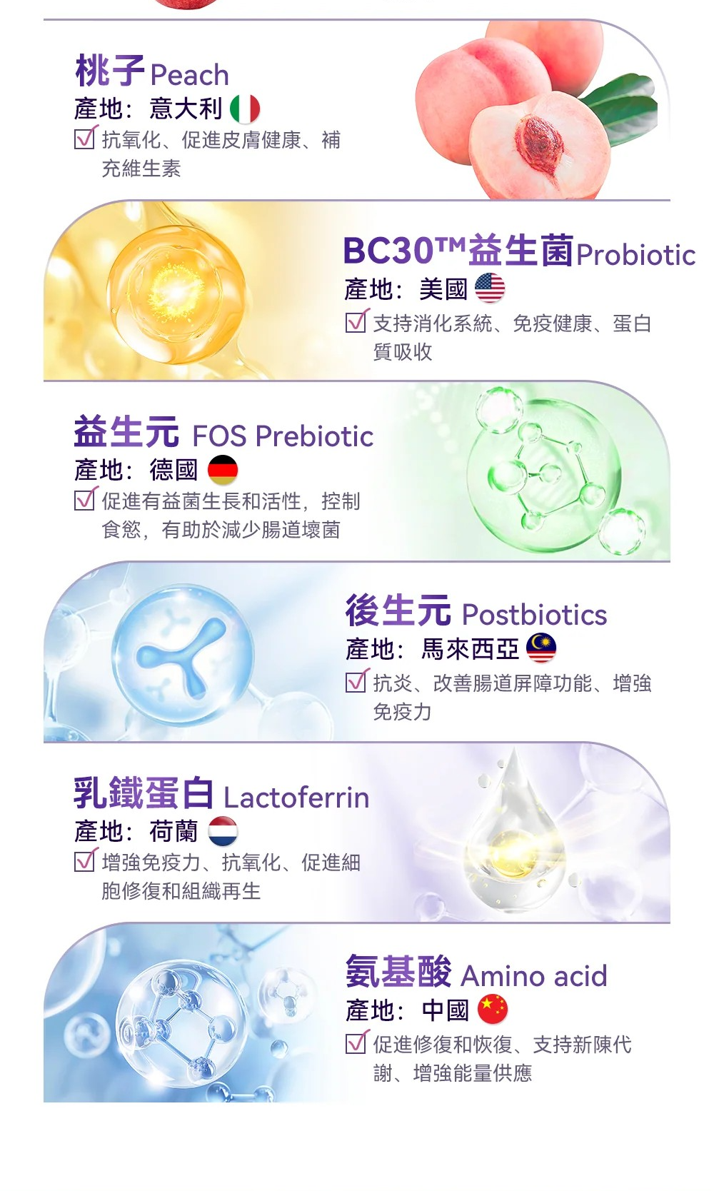 3. 升級益生配方,含有美國專利BC30™凝結芽孢桿菌、益生元和後生元,三者協同能更好促進腸道正常蠕動及腸道健康,從而可提升腸道日常自然排毒功能,養成健康易瘦的體質。