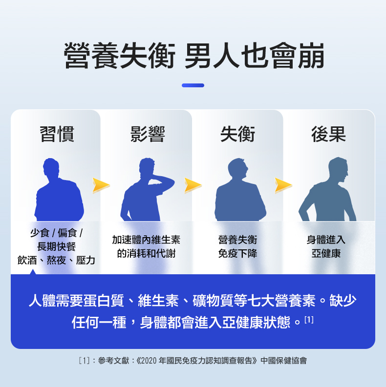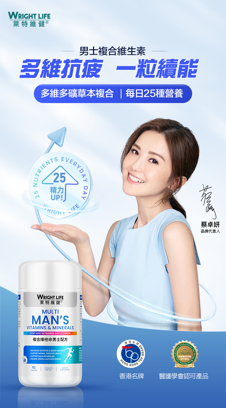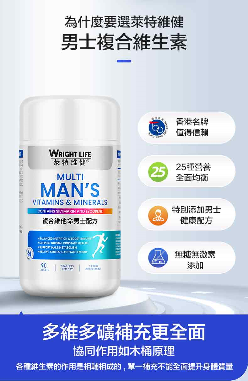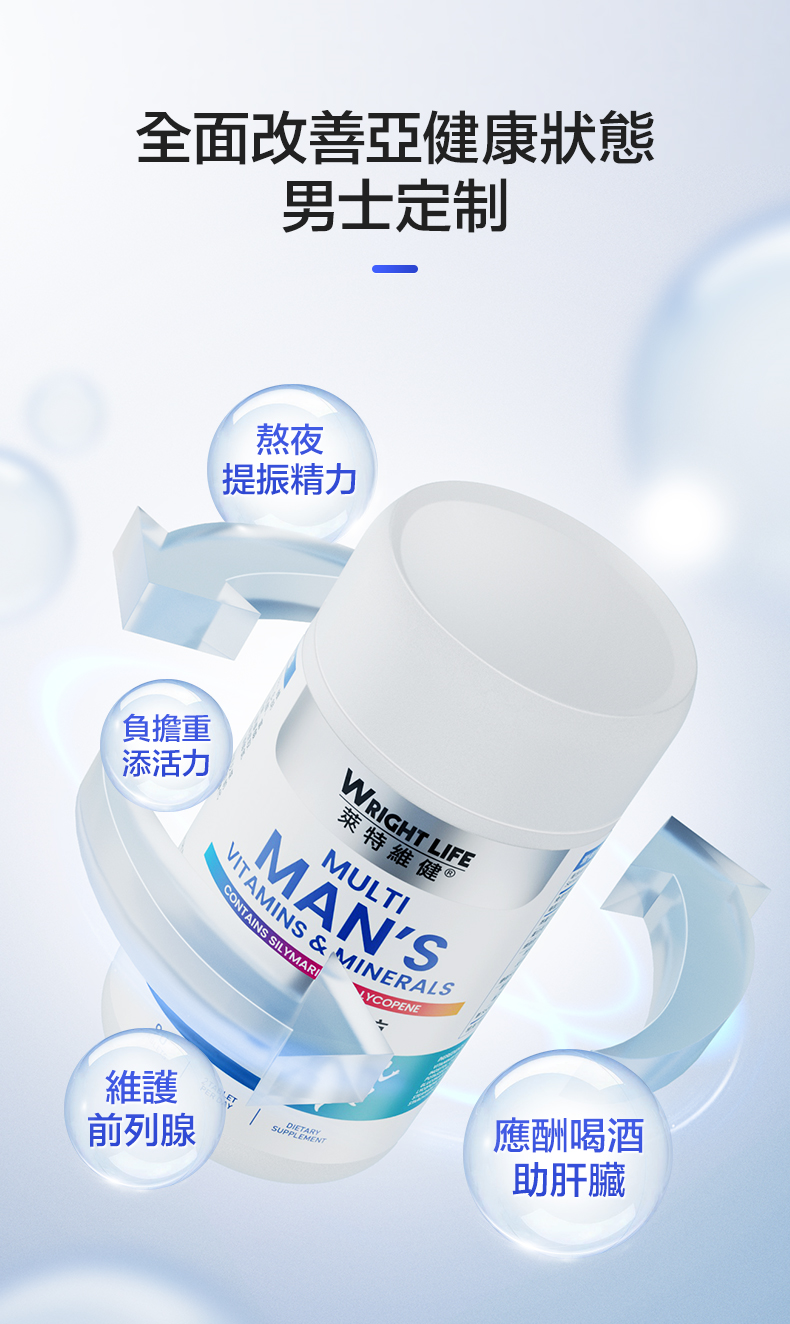 專為亞洲男士專屬定製,補充25種維他命、礦物質及草本精華,均衡營養,增強機體免疫;支持男性前列健康;幫助保持骨骼強健;促進體內新陳代謝,緩解疲勞及焦慮,維護身體健康