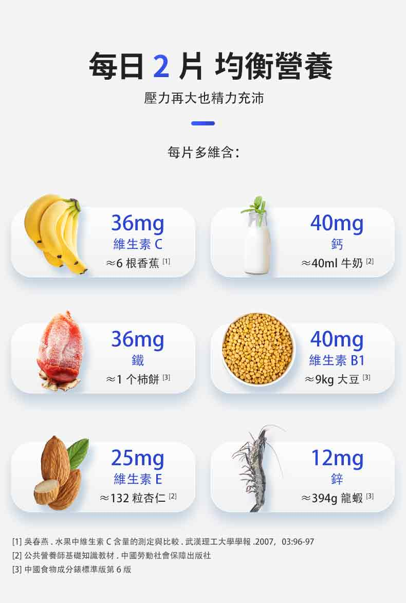 維他命B1、維他命B2、維他命B3、維他命B5、維他命B6、維他命B7、維他命B9、維他命B12、β-胡蘿蔔素、維他命D3、維他命C、維他命E、肌醇、酒石酸氫膽鹼、碳酸鈣、氧化鎂、檸檬酸鉀、富馬酸亞鐵、葡萄糖酸銅、葡萄糖酸錳、檸檬酸鋅、碘化鉀、富硒酵母、番茄紅素、水飛薊提取物、微晶纖維素、硬脂酸鎂、聚維酮K30、二氧化矽、麥芽糊精