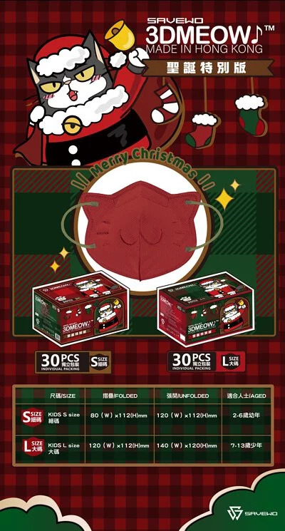 全部商品 / 🛡️1片口罩,全店全選🛡️【7-13歲幼年】* L-細碼 *SAVEWO 3DMEOW 聖誕特別版「聖誕小狼」立體喵口罩 1片獨立包裝/盒
