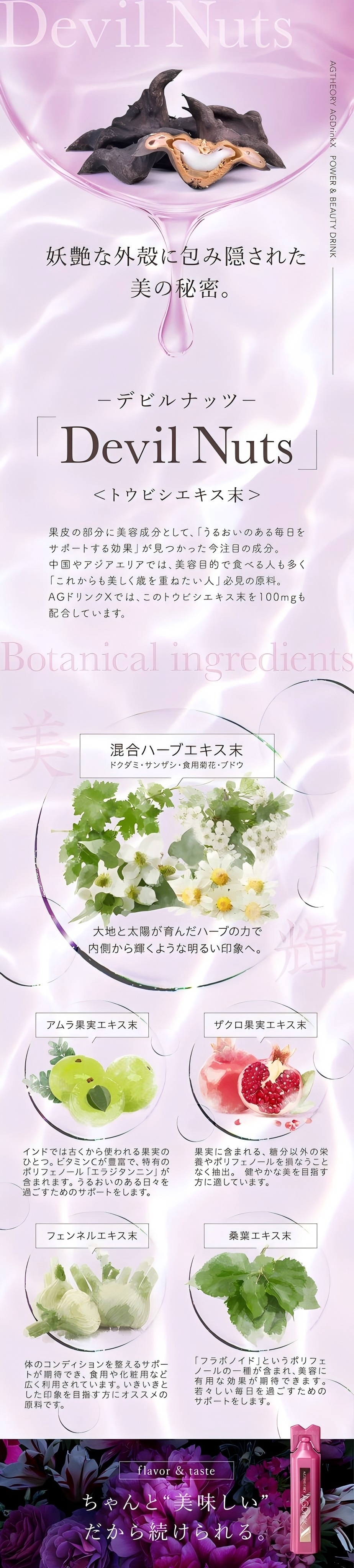 全新AGX抗糖飲拒絕無效抗糖,從始至終高效抗糖!從791種具有抗糖能力的植物中嚴選抗糖性能最高峰的「烏菱角皮提取物」,有助於阻斷AGEs生成,並清除代謝已生成的AGEs。再加上配方技術雙革新的專利成分AG Herb mix™,對抗不同的糖化鏈路高效抗糖,全鏈路狙擊肌膚糖化問題。全新注入神秘果實與嚴選植物的年輕力量,從抑制糖分吸收、阻斷糖