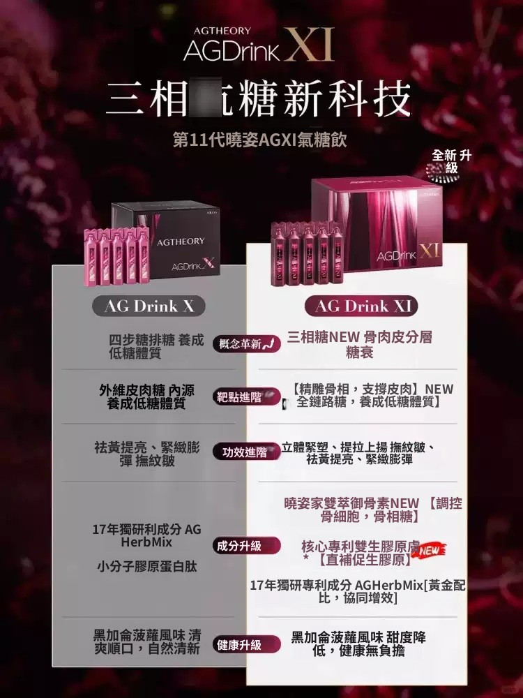 2023年4月,全新AGX抗糖飲耀目上市!全新加入現今備受矚目的豐富美容成分,精創美容配方,四步抗糖排糖,30天養成低糖體質。此次升級,曉姿歷時近一年反復試驗,進行了多次實驗查證,終於完成了功效和風味兼具的全新AGX抗糖飲。