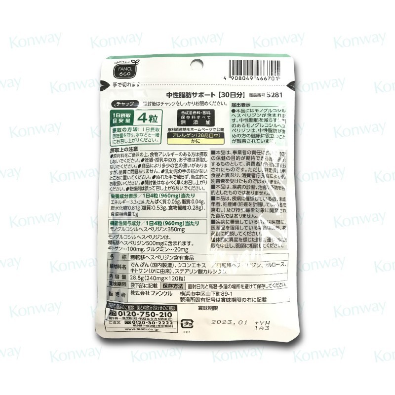 FANCL降低中性脂肪片 -【正品】FANCL 日本製造 心血管健康 改善飲食不當 多吃少動習慣 蟹殼素 單葡糖基橙皮苷 薑黃素