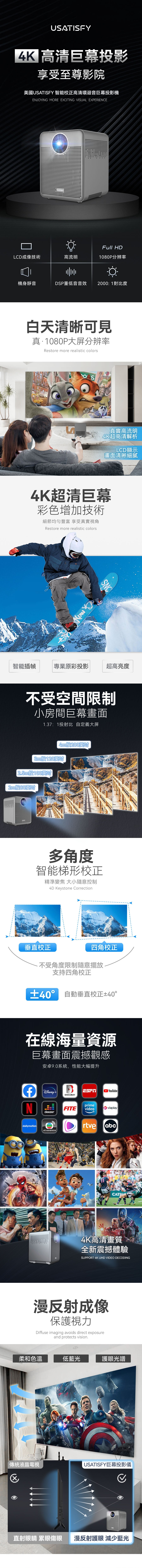 美國USATISFY| 智能校正高清環迴音巨幕投影機【原裝行貨1年原廠保養】